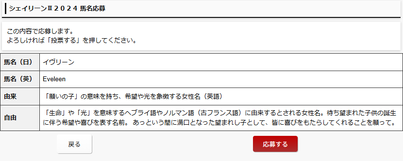 なお、採用された馬名の応募文は以下の通り。