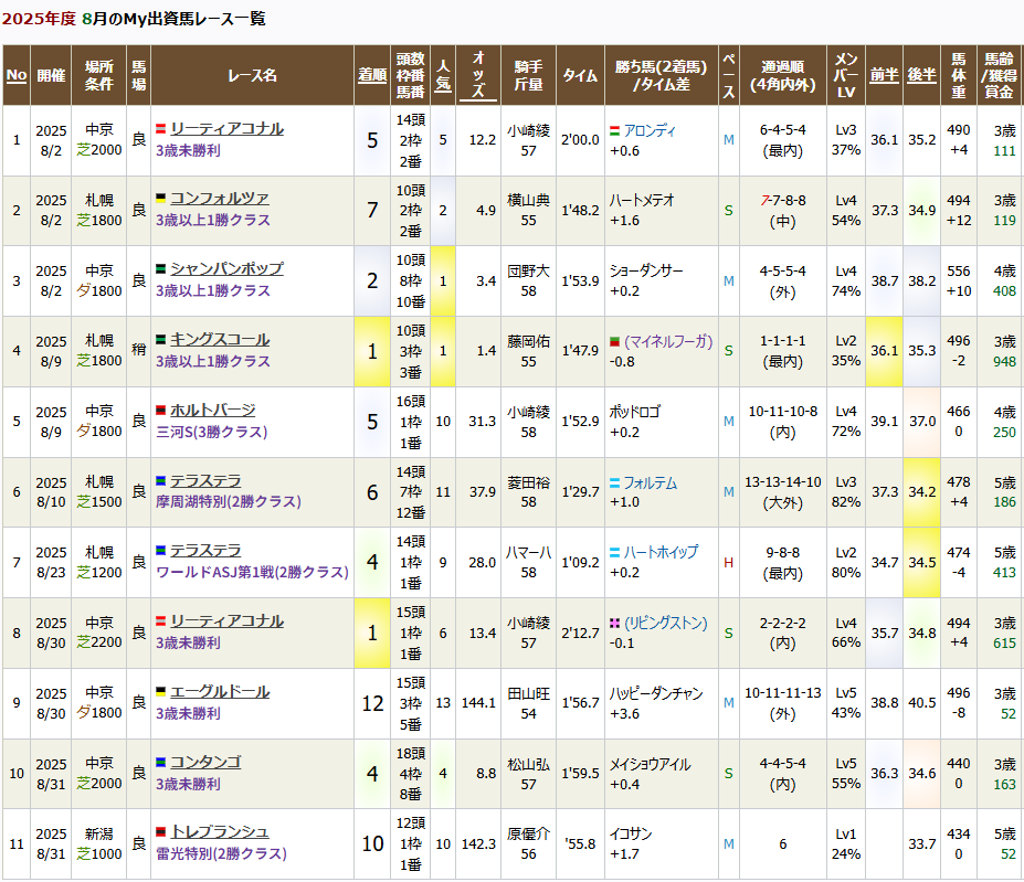 出資馬月報 2025年7・8月度(広尾TC・ワラウカド・YGG・DMM・TCライオン)